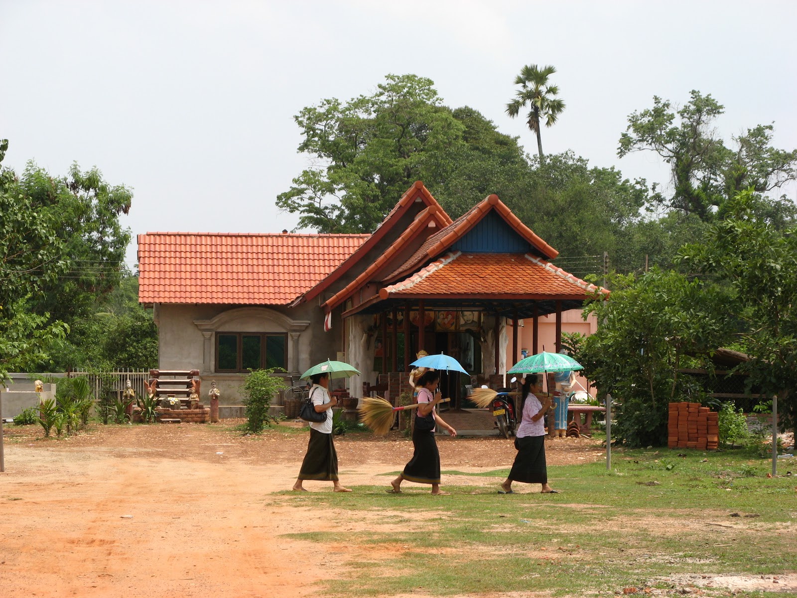Village life - women in traditional Lao skirts in the temple area. The broom that one of the women is carrying was typical to Thailand, Cambodia and Laos; amazingly light but sweeps the sand off wooden floors perfectly.