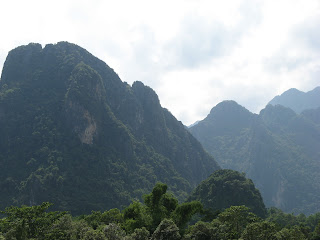 There is no typo in the title - the numerous Vang Vieng t-shirts, tanktops and shorts says exactly that. As described earlier (last year as well in the post about stupidity), Vang Vieng is the backpacker party capital of Laos. It is a smallish village in absolutely stunning scenery - by the Nam Song river with steep craggy hills on the other side. There is plenty of activities available from kayaking to mountain climbing, but most of the travellers seem to opt for partying and floating down the river with huge inner tubes.