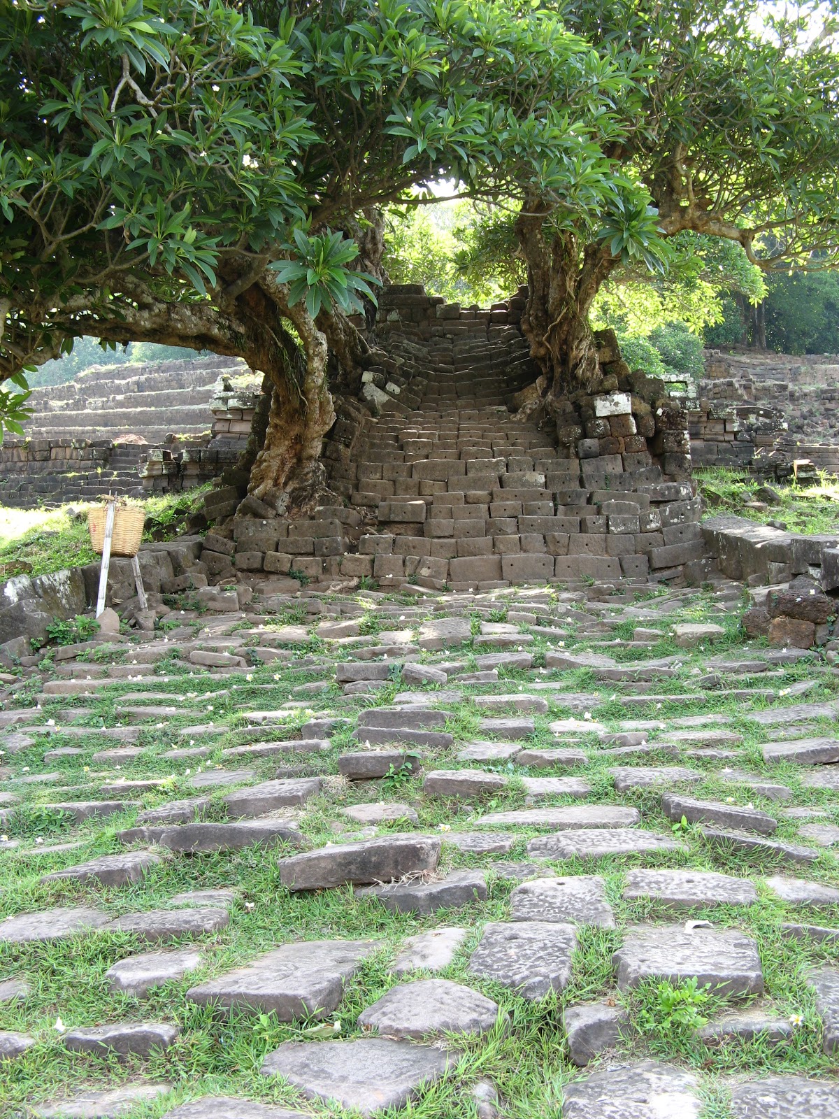 Row of linga-statues leading to Vat Phou. Vat Phou is situated in front of a linga-like mountain making the place especially holy. Also, a holy spring flows near the temple, and the water was directed to a linga statue at the shrine, making the temple one of a kind.