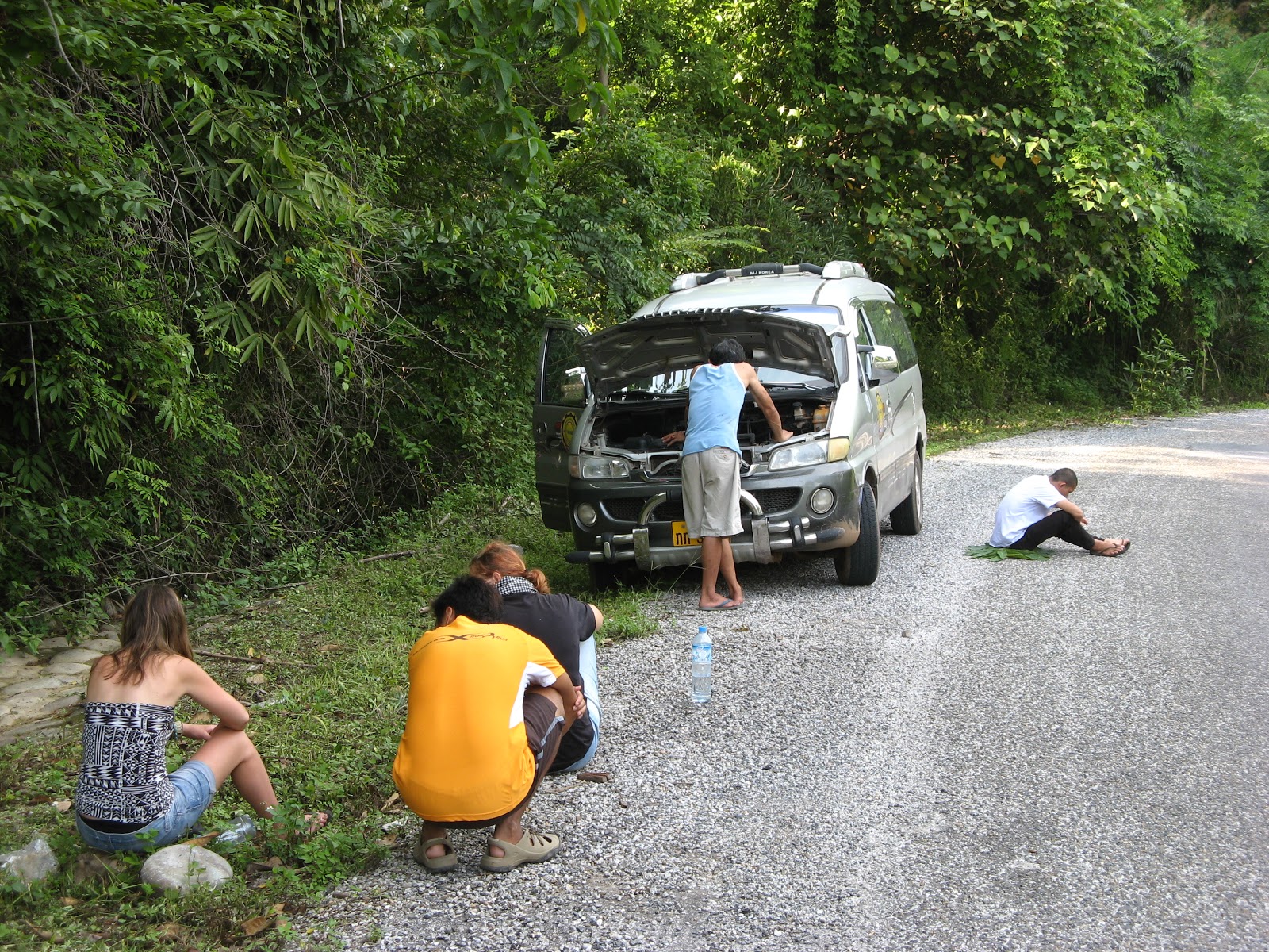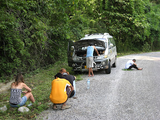 The Kong Lor cave is about two-hour drive away from Thakek, and there are incredible mountain views on the way. We chose to take a minivan there, but some others took motos and it seemed like wonderful scenery for it. Unfortunately our van driver was not exactly top of his profession, and when the motor overheated he had no idea what to do - we used all of our drinking water to the cooling system and made him stop in the next village for more water.