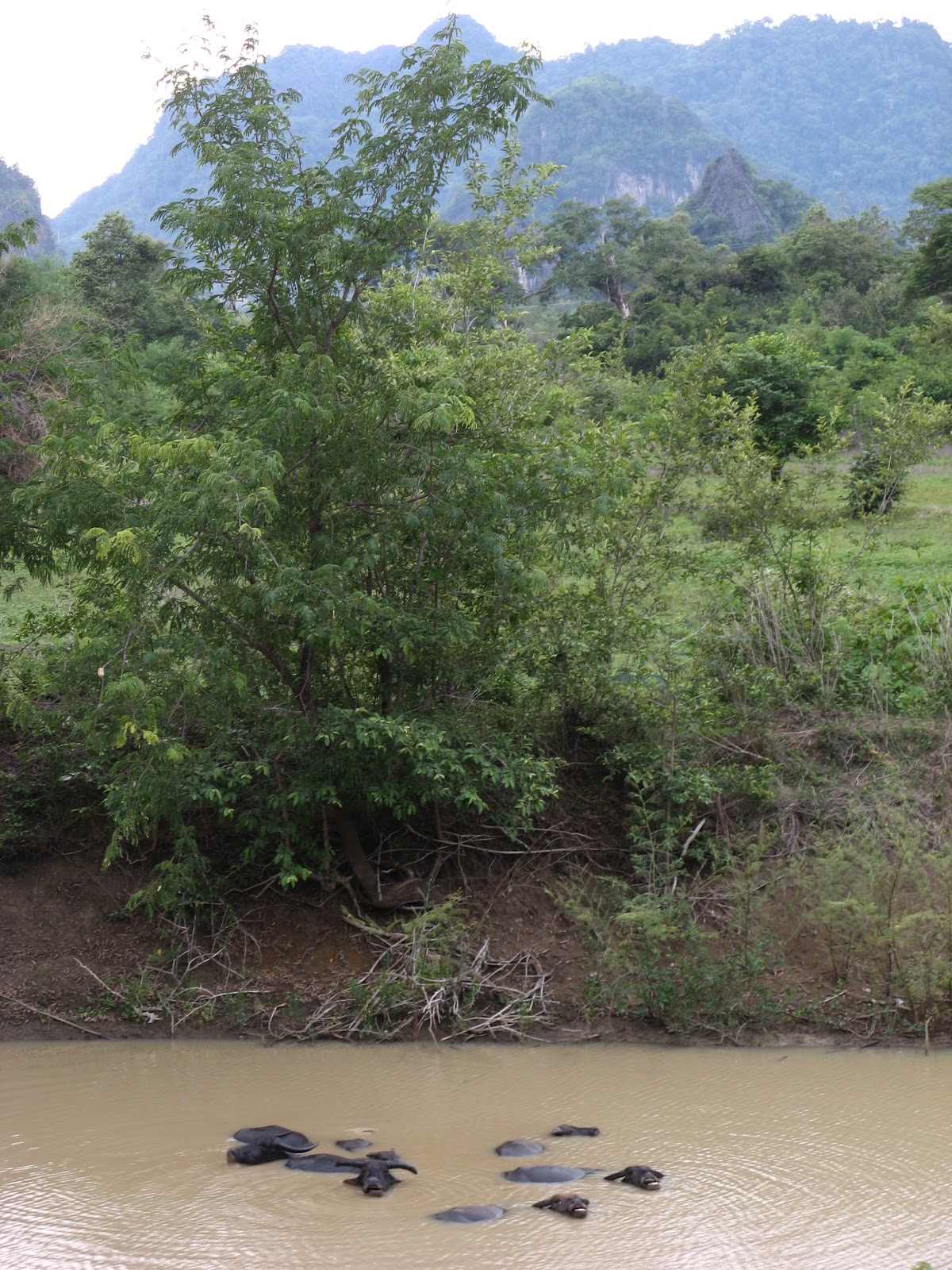 On our second day in Thakek we rented a moto after a whole day of wasting time. We managed to get a lovely evening ride out of it - more gorgeous mountains at the setting sun. We also spotted some water buffaloes bathing in the river.