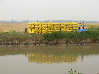 From the bus we saw the rice harvest in full swing. The Mekong delta is the rice bowl of Vietnam, and there seemed to be canals and rice fields everywhere you looked. People were drying the harvested rice on netting by the roadside, bagging it, and loading the bags on scooters, pickups, tractors and boats everywhere. Later on we've learned that the rice gets transported to factories to be cut (de-chaffed) and sold to the government. The chaff gets used for fueling furnaces, so nothing goes to waste. Hopefully I can upload some pictures of the rice harvest later on with a speedier internet connection!