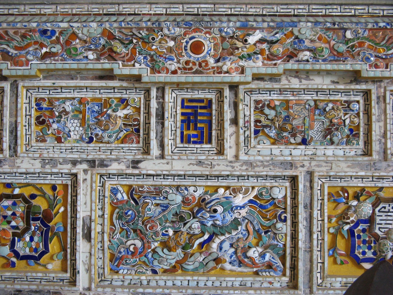 The eulogy of emperor Khai Dinh is carved on a stone slate inside the structure on the front.
