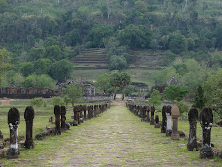 So we took the Friendship bridge to the west bank and the brand new and empty road all the way to Champasak (35 km) and pre-Angorian temple area of Vat Phou. The road took us through beautiful farm areas - one side we had the Mekong river and some mountains on the other. Vat Phou was definitely worth seeing. Much smaller than most other World Heritage temple areas, but prettily laid out by a mountain and with large trees. However, the highlight for me was the moto ride in the beautiful scenery.