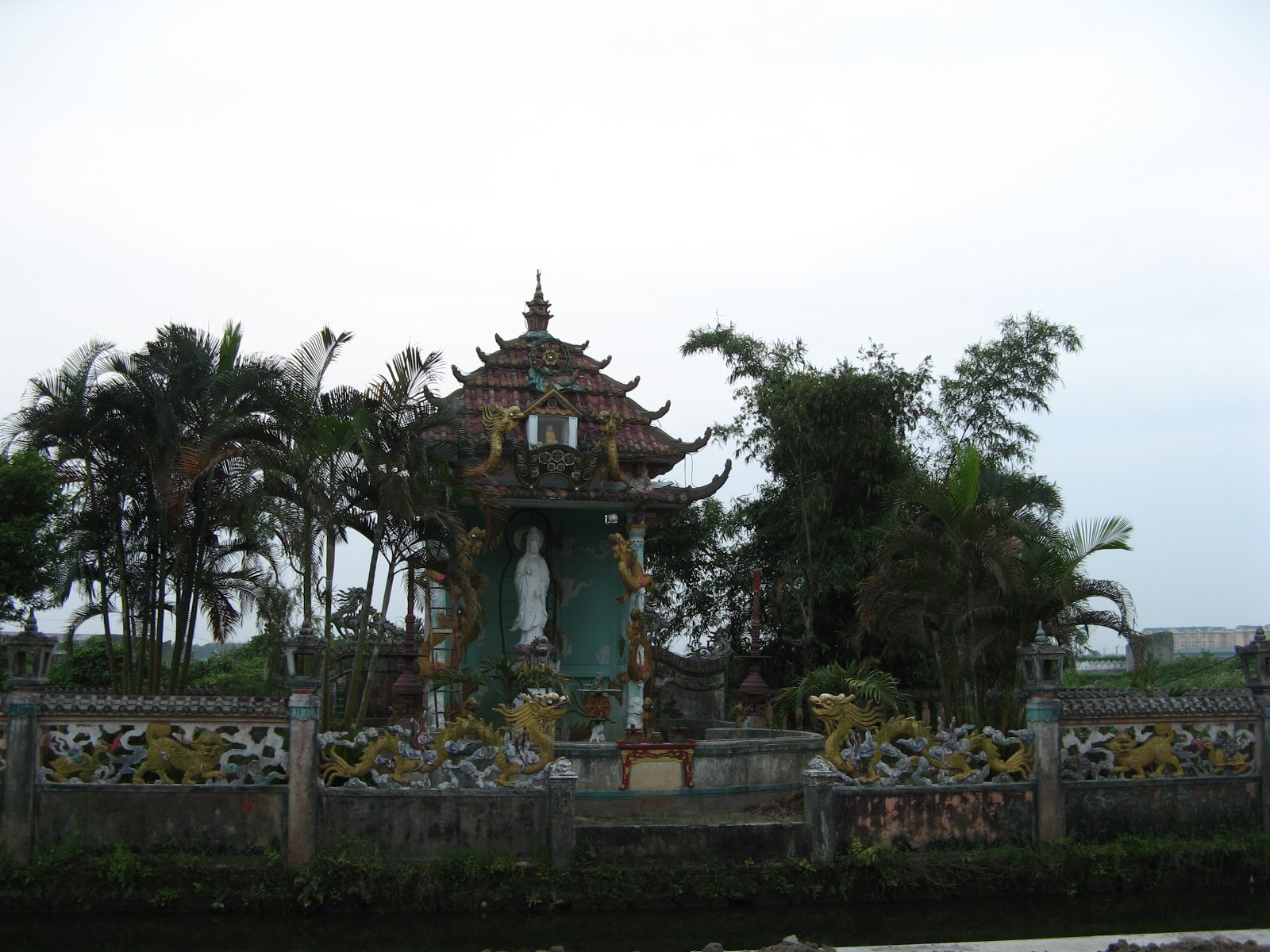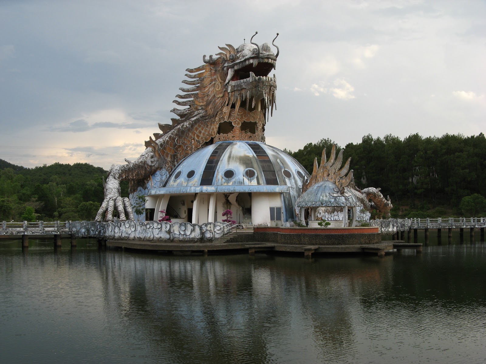 This water park had been being built around a lake, and parts of it had already been opened for public. Unfortunately, a couple of Vietnamese people drowned, probably because most of them cannot swim, and the owners became convinced that the water park is cursed. So they stopped building it, but there still is a guy at the gate collecting entrance fees, as there are some pieces of art to see, the lake to enjoy, and a huge building that looks like dragon. We climbed up to the dragon's mouth for the views and down to the tail to realise it contained an aquarium with all the fish still in there!